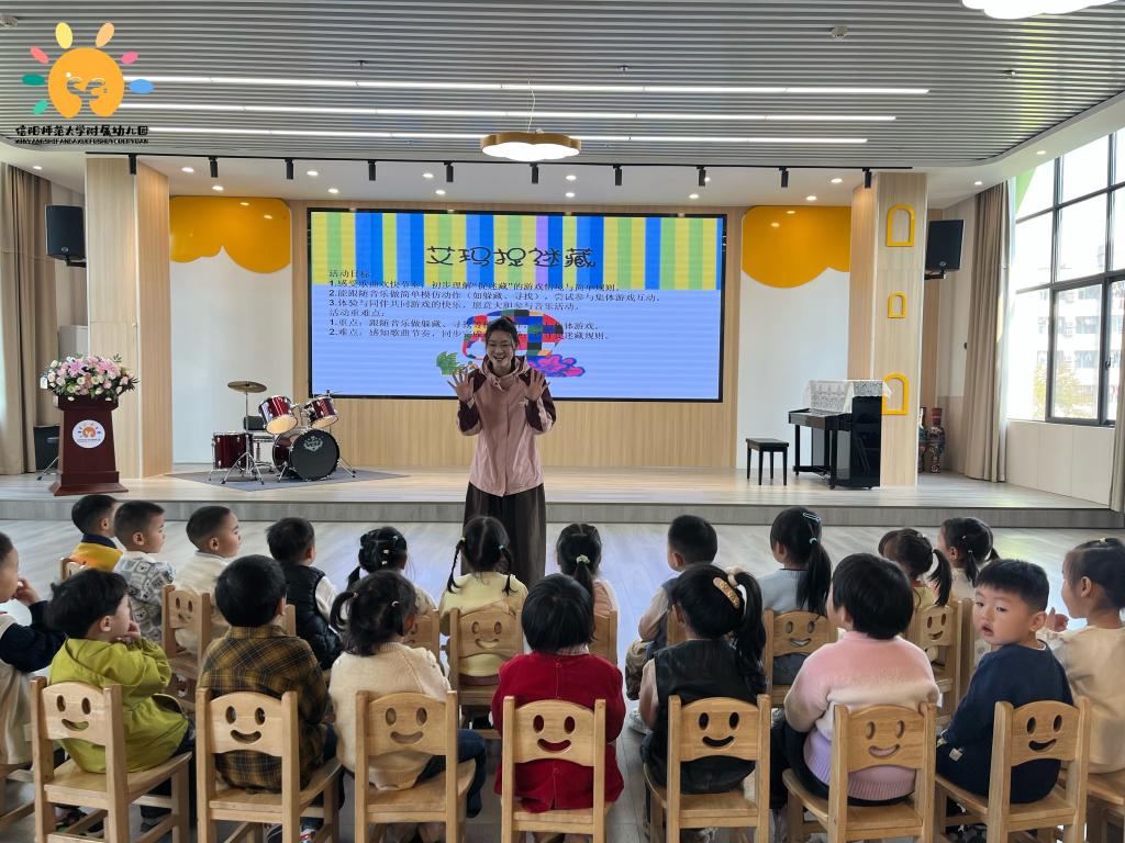 清风班高莉老师以绘本形象“艾玛”为引,将轻快旋律与情境游戏相融。她用节奏感十足的指令、灵动的肢体模拟“躲藏”与“寻找”,以温暖目光与即时鼓励回应每一位孩子,让幼儿在倾听协作中释放童真,在欢快节奏里感受合作乐趣。