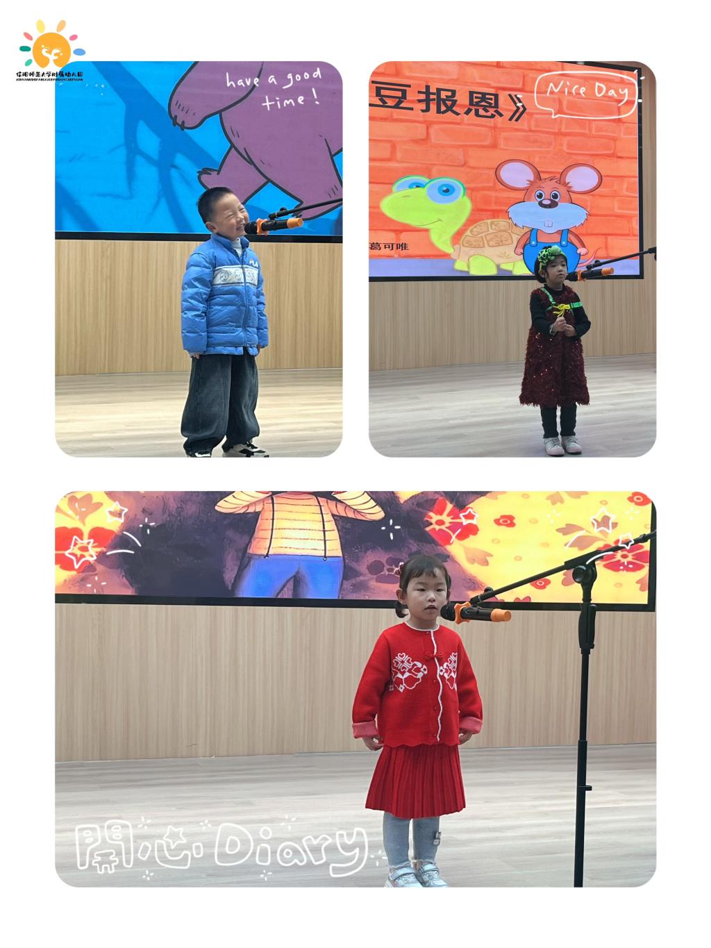 从简单到丰富,天马行空,创意无限。中班的孩子们用他们独特的视角和充满童趣的表达,展现了中班年龄段特有的成长特点——语言表达能力显著提升,想象力丰富,情感表达更加细腻,同时具备一定的合作意识。他们大胆地表现自己,时而模仿角色对话,时而做出夸张动作,时而轻声细语,时而慷慨激昂,塑造出了一个个生动而又鲜明的角色形象,台下的观众们听得聚精会神。他们的表现不仅为阅读注入了鲜活的生命力,更让人仿佛看到了一颗颗智慧的种子在书香的滋养下悄然发芽,茁壮成长。