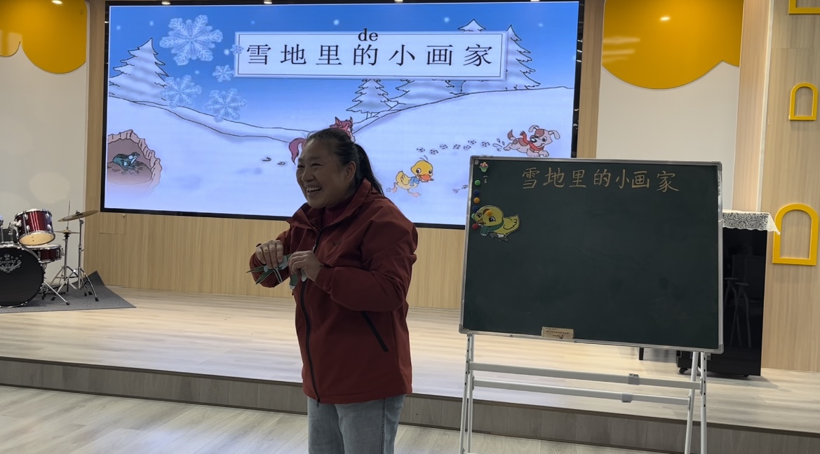 思齐班郭景云老师聚焦语言领域,以经典篇目《雪地里的小画家》为载体,打造了一堂生动鲜活的语言课。郭老师通过情景导入、角色模仿、画面联想等方式,引导“幼儿”(教研中以教师模拟幼儿)感受诗歌的韵律美与画面感;更借助手偶、雪景道具,让抽象的文字变得可触可感,充分调动了“幼儿”的表达欲望,为语言教学如何“化抽象为具体”提供了优秀范本。