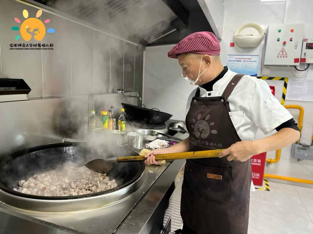有人说,幼儿园的老师是站在讲台前的守护者,但李师傅的“讲台”,是三尺灶台;他的“课本”,是每日更新的营养食谱;他的“学生”,是每一个捧着餐盘、眼睛亮晶晶的孩子。从行业新人到经验丰富的厨师长,20余年的厨艺生涯里,他把最宝贵的时光都留给了信阳师范大学附属幼儿园:每天凌晨核对食材检疫报告,确保每一颗青菜、每一块肉都来源可溯;清洗、切配、烹饪的每一步,他都守在现场,连菜品出锅前的温度都要反复确认;遇到挑食的孩子,他会悄悄调整菜品的软烂度,把胡萝卜切成星星、把土豆做成小丸子,让“吃饭”变成孩子们期待的事。