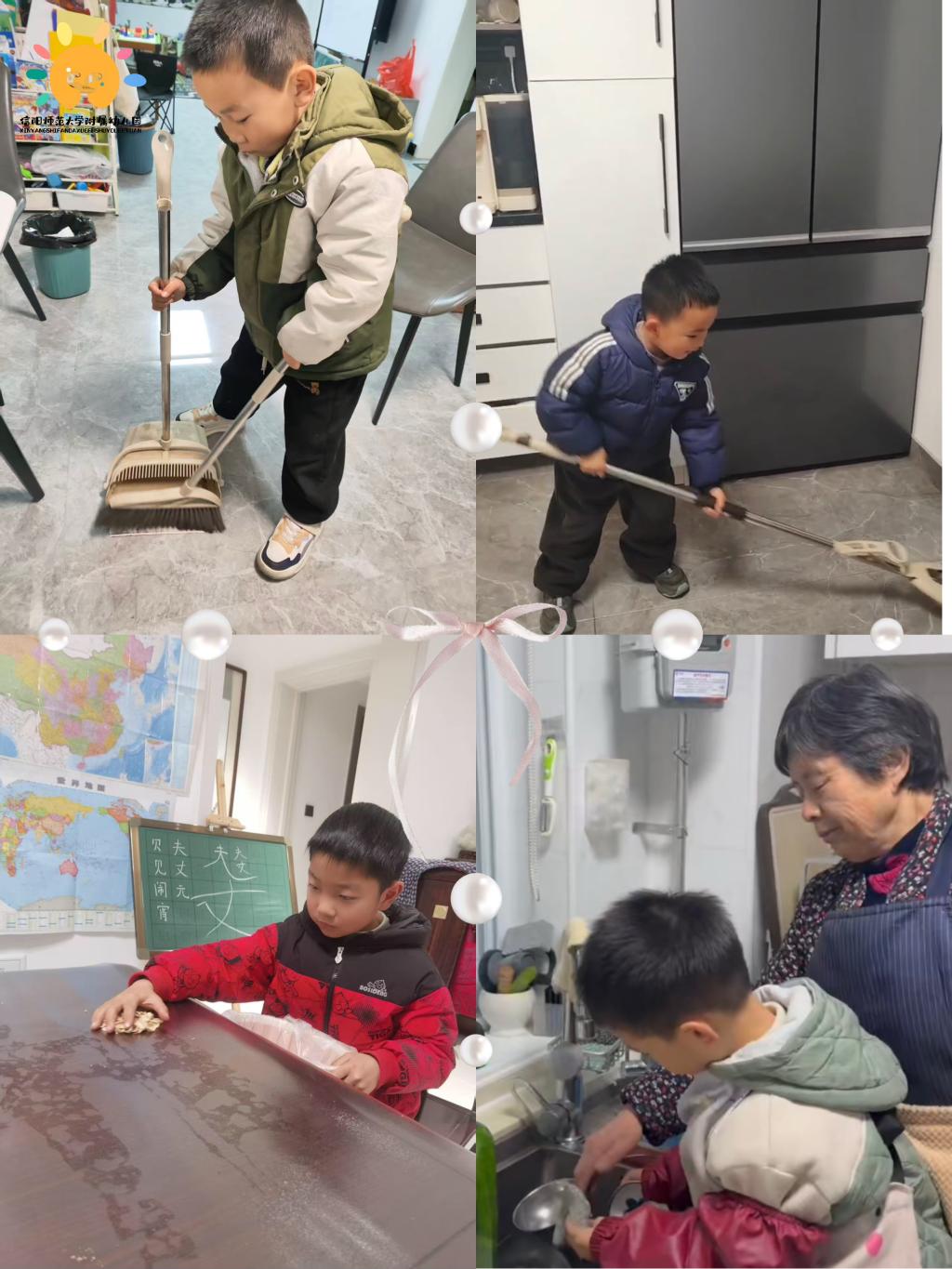 分担家务:帮妈妈扫地、擦桌子、洗碗,虽然动作稚嫩,但态度认真,让妈妈感受到孩子的成长与贴心。