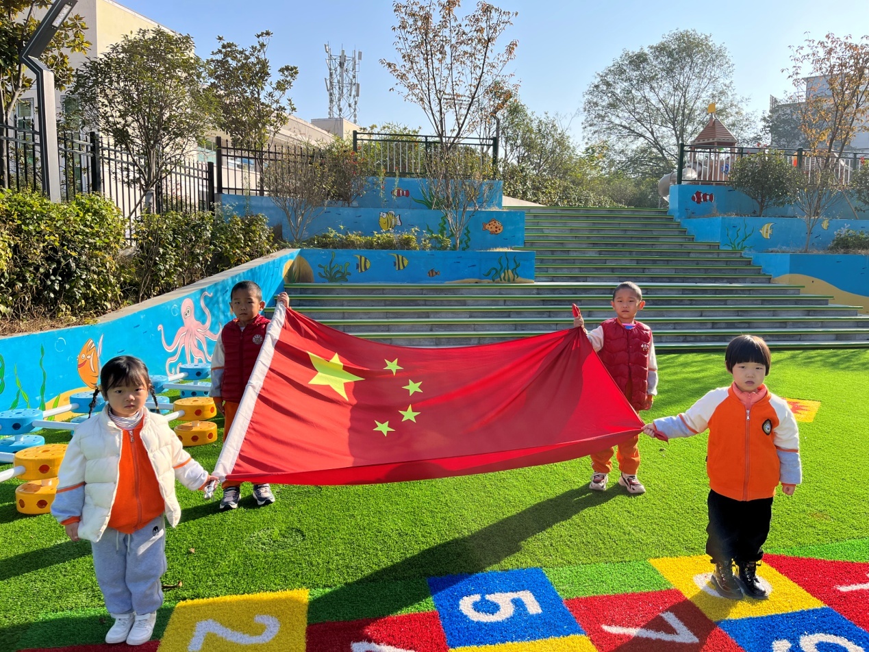 当国歌声响彻幼儿园,全园师生面向国旗,行注目礼,一双双闪亮的小眼睛紧紧注视着五星红旗,鲜艳的国旗升起,飘扬在幼儿园的上空。孩子们用稚嫩的童声,表达了对祖国和五星红旗的崇敬之情。