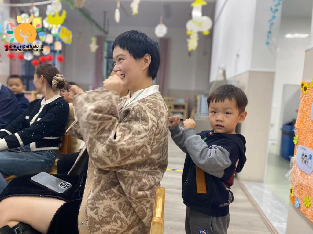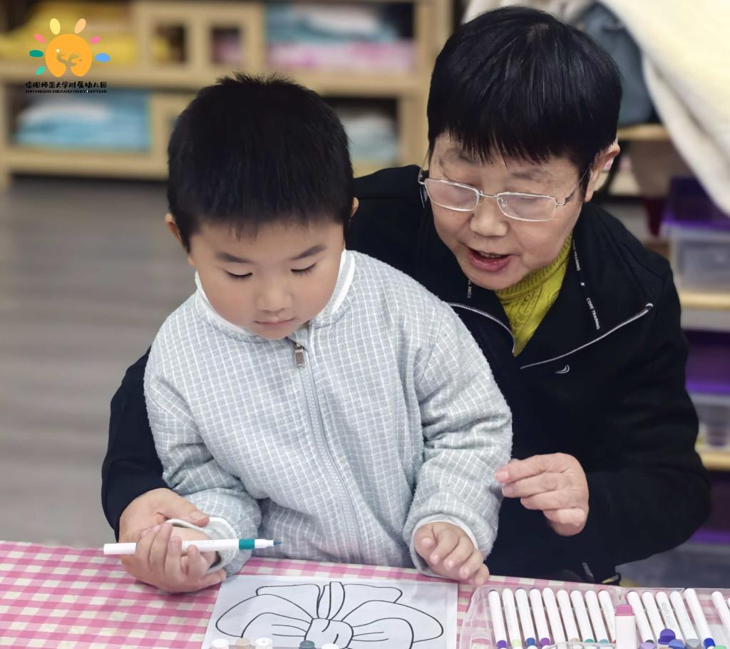春蕾班的小宝贝们围着“爷爷奶奶”,跟着欢快节奏小手轻轻捶、慢慢揉,小眉头皱着超认真,软乎乎的模样暖到心巴上;秋实班宝贝与长辈围坐涂画,肉嘟嘟小手捏彩笔填色、递画,每笔色彩都裹着对长辈的甜爱;清风班的萌娃们更灵动,小身子晃呀晃,把最纯粹的孝心跳成了最可爱的模样。