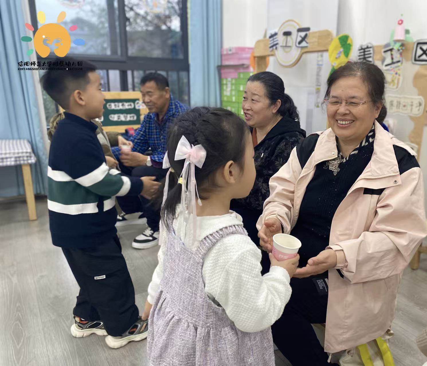 沁园班的宝贝小手捧着茶杯轻轻递上,动作虽稚嫩却满是诚意,把对长辈的孝心与敬意,顺着温热的茶香悄悄传递。静园班的宝贝挂着治愈系笑容,小手捶捶、抱抱,每一个亲昵动作都藏着祖孙间的悄悄话,看得人心里软软糯糯。