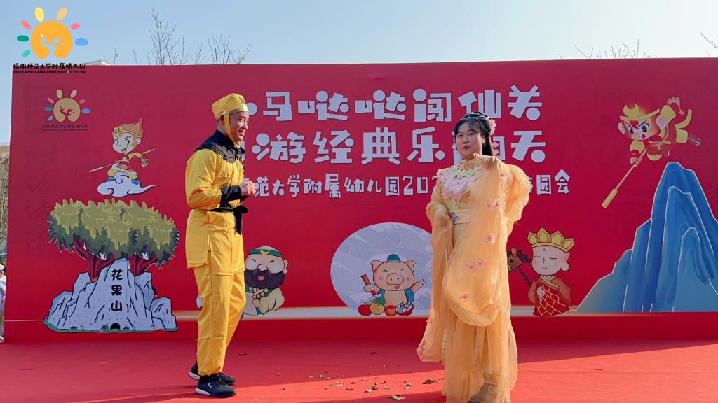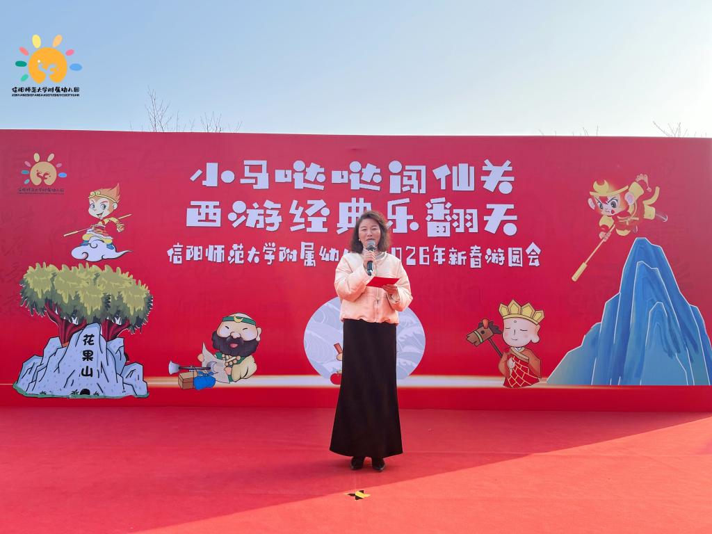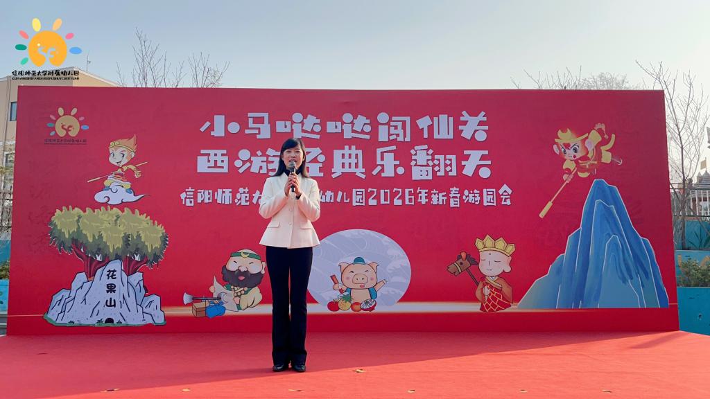 上午9点,游园会正式拉开序幕。首先,信阳师范大学附属幼儿园园长郑晶晶登台发言,她阐释了2026马年“奋进向上”的精神内核与《西游记》中师徒协作、坚持不懈的理念契合点,提及此次游园会是读书月活动的延伸,旨在让传统文化浸润童心,同时向长期支持幼儿园工作发展的校领导、教职工与家长致以诚挚感谢。